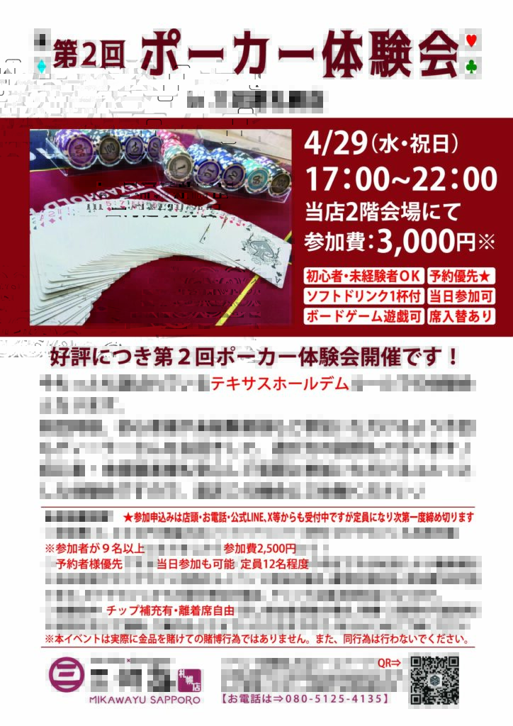 ◎『第2回ポーカー体験会』を4/29(水・祝)開催いたします!!前回の第1回も好評をいただき、早速の第2回開催となります!前回同様に初心者様や未経験者様も楽しんでいただけるよう、店外からディーラーさんをお招きして、遊び方のご説明もいたしますので気軽にご参加いただける、ゆるっとしたポーカー会となっております。